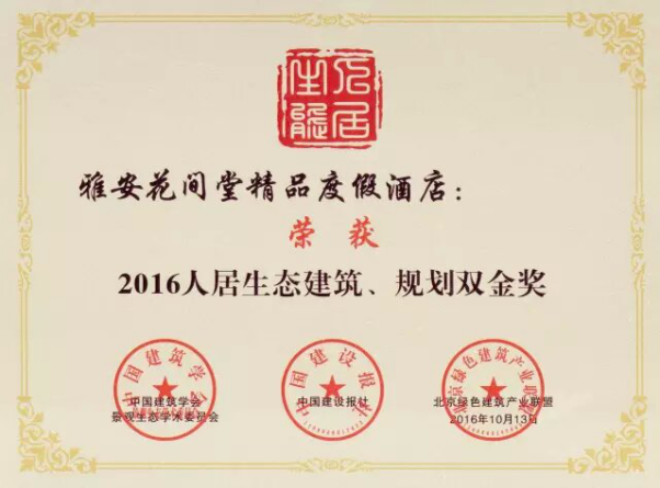 据悉,“人居生态建筑规划金奖”被誉为国内地产界的“诺贝尔奖”,自2001年创办以来,已连续成功举办16届,是我国建筑规划设计行业极具权威和公信力的奖项。该奖项由中国建筑学会、景观生态学术委员会、中国建设报社、北京绿色建筑产业联盟共同设立,面向建筑领域的建筑科学技术奖。“雅安花间堂精品度假酒店”项目设计方案获此殊荣,无疑将进一步提升项目知名度和影响力,促进雅安文化旅游产业上档上级。