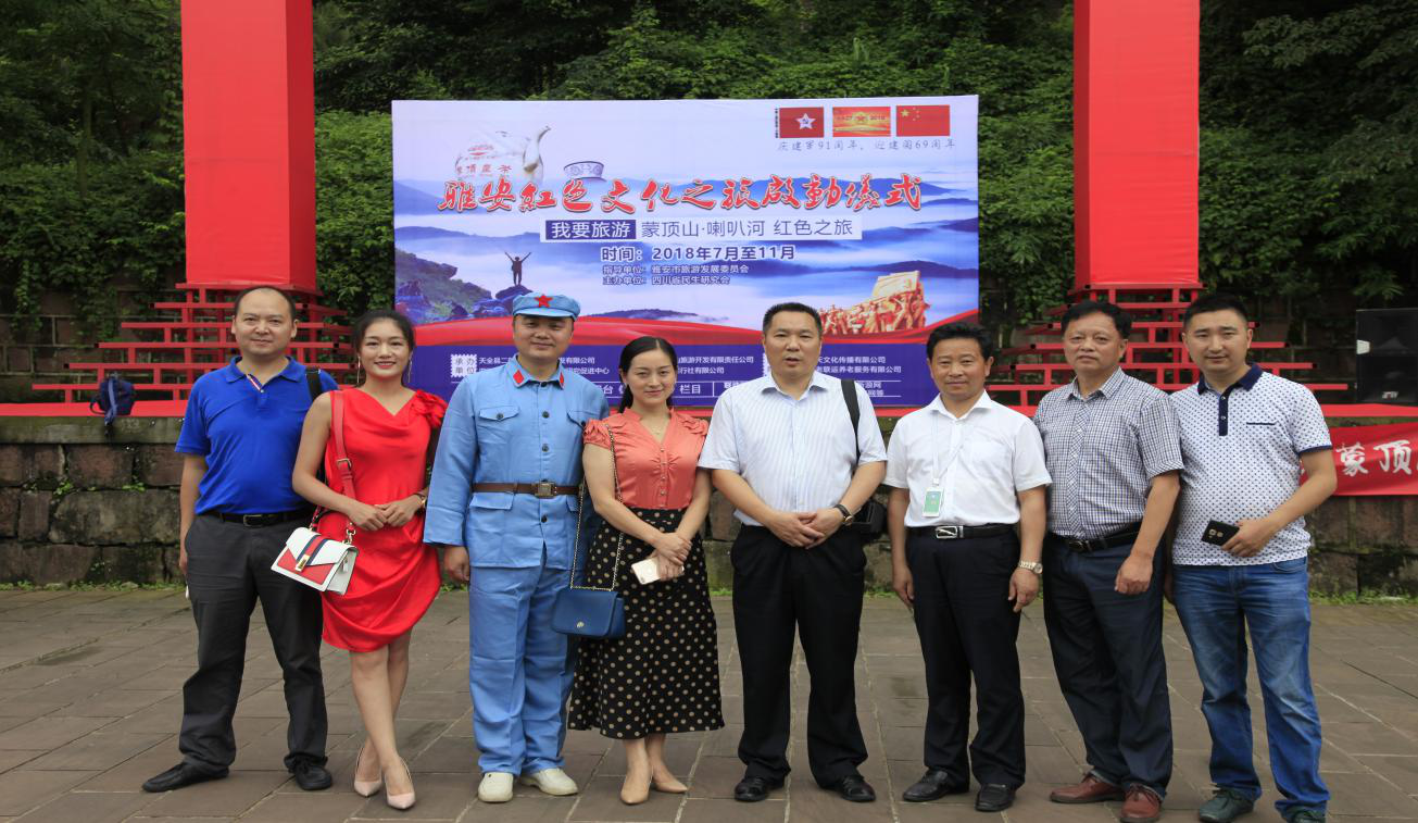为庆祝建军91周年,7月29日,由雅安市旅游发展委员会指导,四川民生研究会主办,天全县二郎山生态旅游开发有限公司、四川省名山蒙顶山旅游开发有限责任公司、四川省民生研究会互助养老研究促进中心、四川太平洋国际旅行社有限公司承办的“重走长征路,传承红色文化”雅安蒙顶山·喇叭河红色之旅在蒙顶山景区举行开幕授旗仪式,雅安市旅发委副主任孟水明为活动授旗,标志着为期4个月的红色文化之旅拉开序幕。