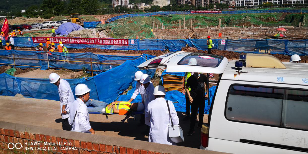 本次演练分为疏散保卫组、医疗救治组、物资保障组、应急救援组和信息发布组五个防洪防汛应急演练组。现场模拟演练周公堰河水因连续暴雨导致河水上涨,漫过堰堤,雅安熊猫会展博览馆基坑作业面大量进水,项目安全负责人确认险情后,立即启动防汛应急预案。