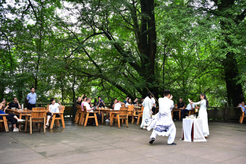 4日下午,旅行社一行走进蒙顶山景区,先后考察了蒙顶山景区甘露井、皇茶园等茶文化历史遗迹,欣赏了蒙顶山非遗传承龙行十八式茶技及天风十二品茶艺并在蒙顶山天盖寺皇茶楼就“名山旅游发展及如何吸引旅行社组团到名山”进行座谈交流。