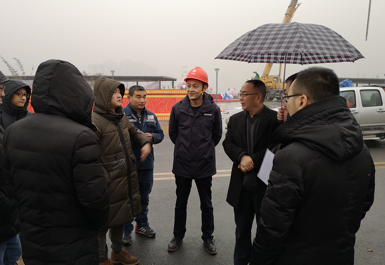 任明辉和电力工程师对会场内灯组摆放点位和电力接入情况进行了现场查看,就电力接入难点向灯组制作安装单位进行了详细的讲解指导。