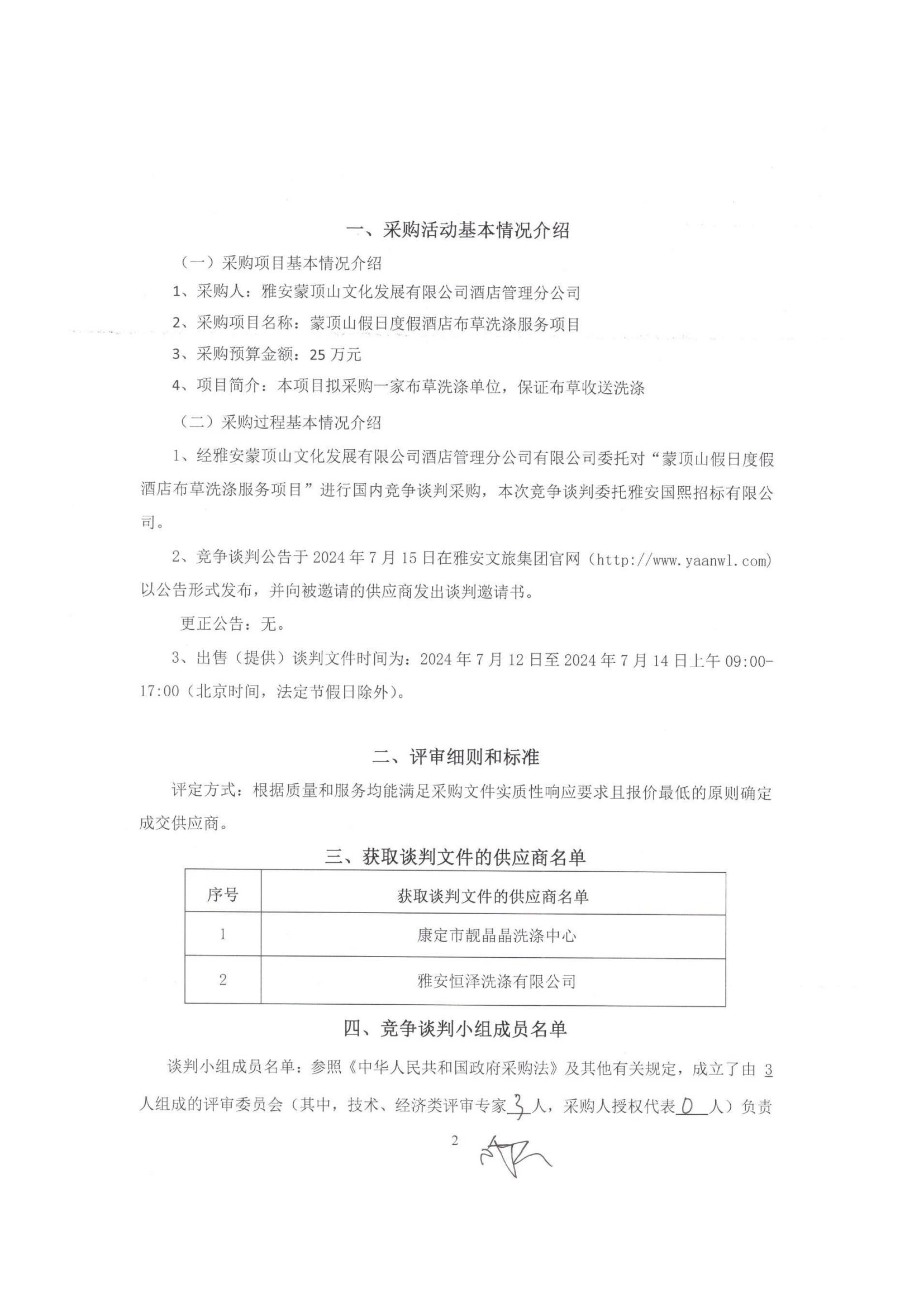 蒙顶山假日度假酒店布草洗涤服务项目评审报告