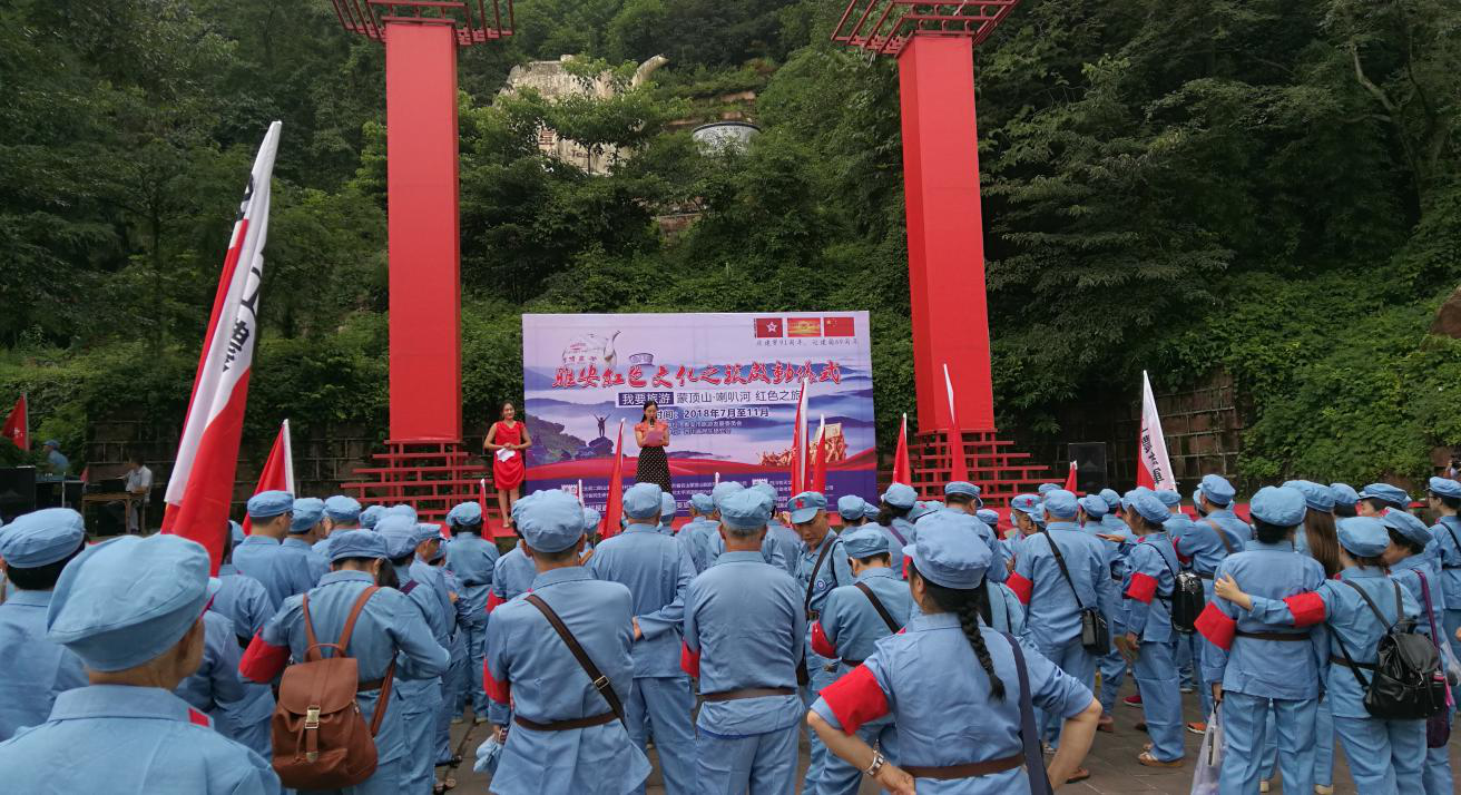 为庆祝建军91周年,7月29日,由雅安市旅游发展委员会指导,四川民生研究会主办,天全县二郎山生态旅游开发有限公司、四川省名山蒙顶山旅游开发有限责任公司、四川省民生研究会互助养老研究促进中心、四川太平洋国际旅行社有限公司承办的“重走长征路,传承红色文化”雅安蒙顶山·喇叭河红色之旅在蒙顶山景区举行开幕授旗仪式,雅安市旅发委副主任孟水明为活动授旗,标志着为期4个月的红色文化之旅拉开序幕。