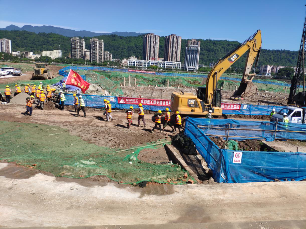 本次演练分为疏散保卫组、医疗救治组、物资保障组、应急救援组和信息发布组五个防洪防汛应急演练组。现场模拟演练周公堰河水因连续暴雨导致河水上涨,漫过堰堤,雅安熊猫会展博览馆基坑作业面大量进水,项目安全负责人确认险情后,立即启动防汛应急预案。