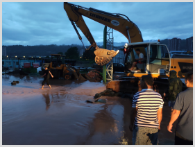 汛情就是命令,险情即是战场。暴雨面前,项目现场雅安文旅人勇当抗洪一线的逆行者,靠前作战,第一时间组织人员全面排查,投入抢险,全力开展抢险救灾工作。一次次冒雨前行,一夜夜通宵抢修,无畏暴风骤雨,现场3台挖掘机轰隆声不断,60余名抢险人员在应急小组领导下紧张而有序的开挖泄洪通道,同时第一时间与下游大唐电站相关负责人取得联系,请求启用片区3台泄洪泵。随着泄洪通道的开挖以及3台泄洪泵的启用,现场积水迅速排出,险情得到有效控制。