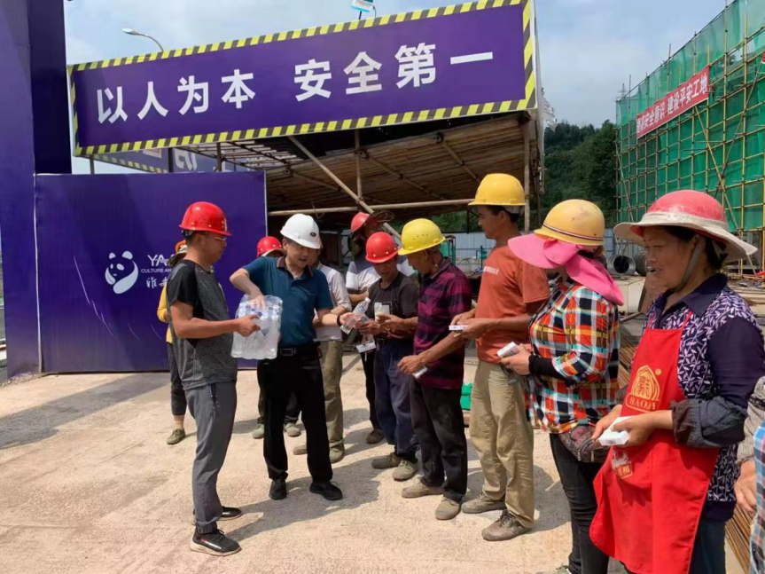 在熊猫高地和皇茶项目,王跃分别向户外高温作业下的现场施工人员及管理人员派发藿香正气液、矿泉水等防暑降温物资,把清凉送到了生产一线,把关怀送到了员工心坎。他首先感谢大家克服高温炎热、尽职尽责的工作,并叮嘱大家在保证安全生产的同时,一定要注意做好防暑降温工作,避免中暑,将自己身体健康放在首位,为公司发展再建新功。