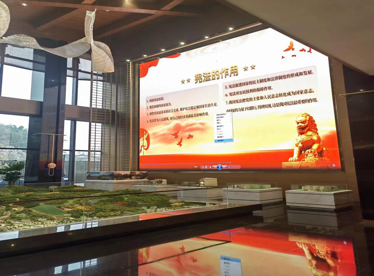 三是定点投放宪法宣传标语。为加强宪法宣传,提高公民的法律意识,同时起到时刻提醒公民关注宪法、了解宪法的作用,雅安文旅集团通过酒店大屏、建设工地、房产销售中心等多处电子宣传屏投放宪法宣传标语,以此营造良好的宪法宣传氛围,增强了宪法学习宣传声势,形成了规模效应。