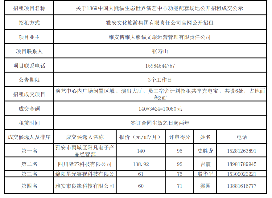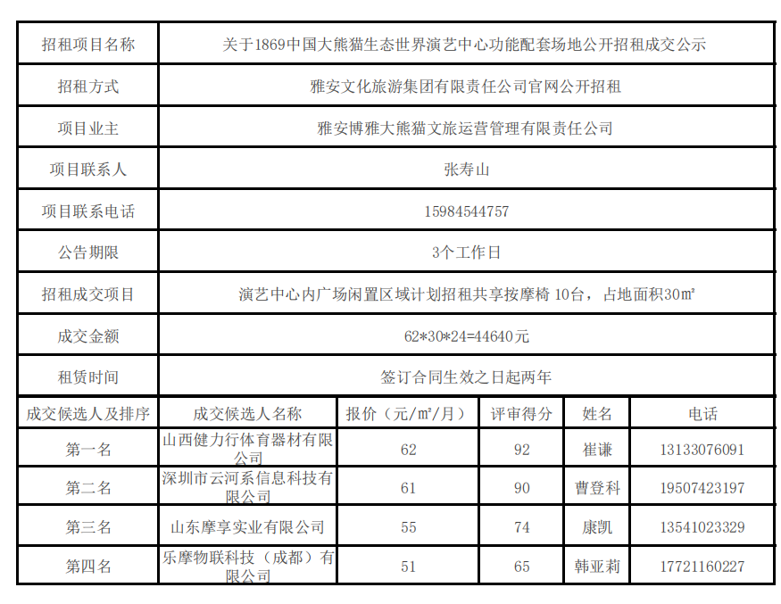 关于1869中国大熊猫生态世界演艺中心功能配套场地公开招租成交公示